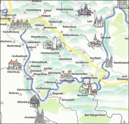 In Oberfranken entspringt er gleich zweimal als Weißer und als Roter Main, durchbricht den fränkischen Jura, umschlingt die Buntsandsteingebirge von Spessart und Odenwald: Der Main, der mittels Rhein-Main-Donau-Kanal das Schwarze Meer mit der Nordsee verbindet, präsentiert sich auf der Karte wie eine Fieberkurve: horizontale Grundlinie, energisches Auf und Ab. Hier ein Viereck, da ein Dreieck, Schlangenlinien, Schlaufen, Schwünge, als tanze der Main durch Deutschlands Mitte.
