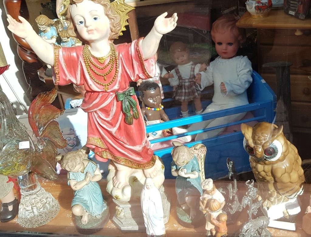Ab und zu – so meint er – verfügen sich die Eltern aus dem Jenseits in sein Arbeitszimmer. Flügelfächelnd lächeln sie skeptisch, wenn er sich gerade über eigene oder fremde Texte beugt. Auf dem Schreibtisch zwei Lampen, eine mit schwerem Messingfuß. Und ganz in der Nähe eine Eule, die vor drei Jahren mit mir Kontakt aufnahm, sie saß (siehe rechts unten) in einem Schaufenster in Amorbach und wollte raus.